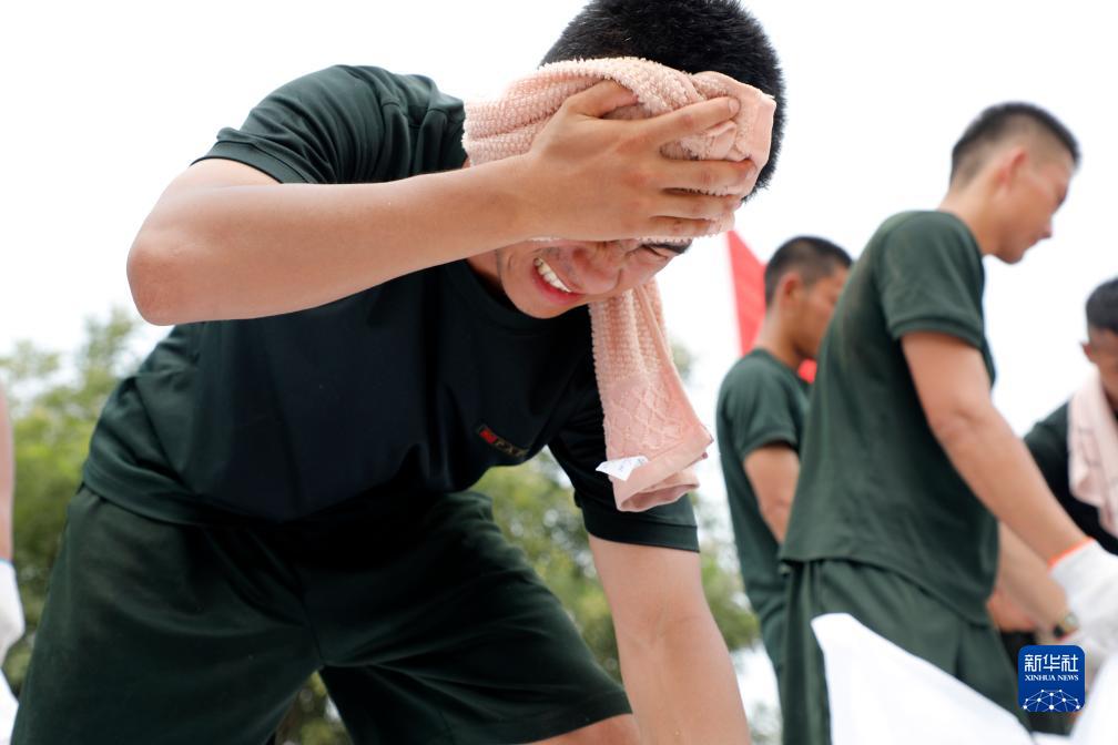 8月10日,武警第一機動總隊某支隊官兵在堤壩加固現場搬運沙袋。