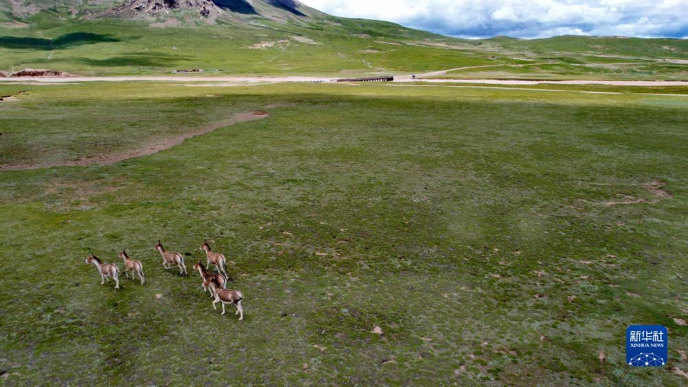 通天河支流辮狀河道旁的藏野驢(7月26日攝,無人機照片)。