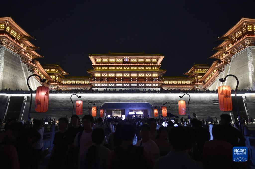 夏夜時分,河南省洛陽市隋唐洛陽城國家遺址公園應天門遺址博物館燈火輝煌,熱鬧非凡,滿目的人間煙火再現千年古都繁華盛景。