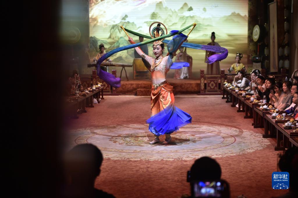 8月11日晚,游人在洛陽應天門遺址博物館內觀賞演出。