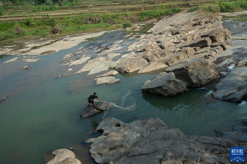 8月7日,在印度尼西亞西爪哇省的茂物,農(nóng)民在鄉(xiāng)間一條河流上撒網(wǎng)捕魚。這條河流的水量大為減少幾近干涸。
