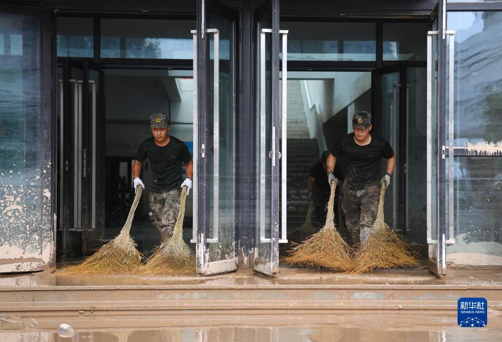 8月10日,武警河北總隊保定支隊?wèi)?zhàn)士在涿州中學(xué)教學(xué)樓清淤。