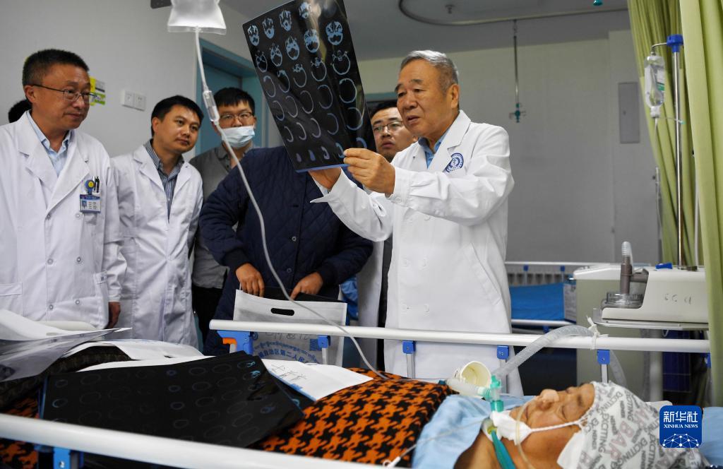 8月10日,中國科學院院士、首都醫科大學附屬北京天壇醫院神經外科學中心主任醫師趙繼宗(后右一)在西藏自治區第二人民醫院為患者會診。