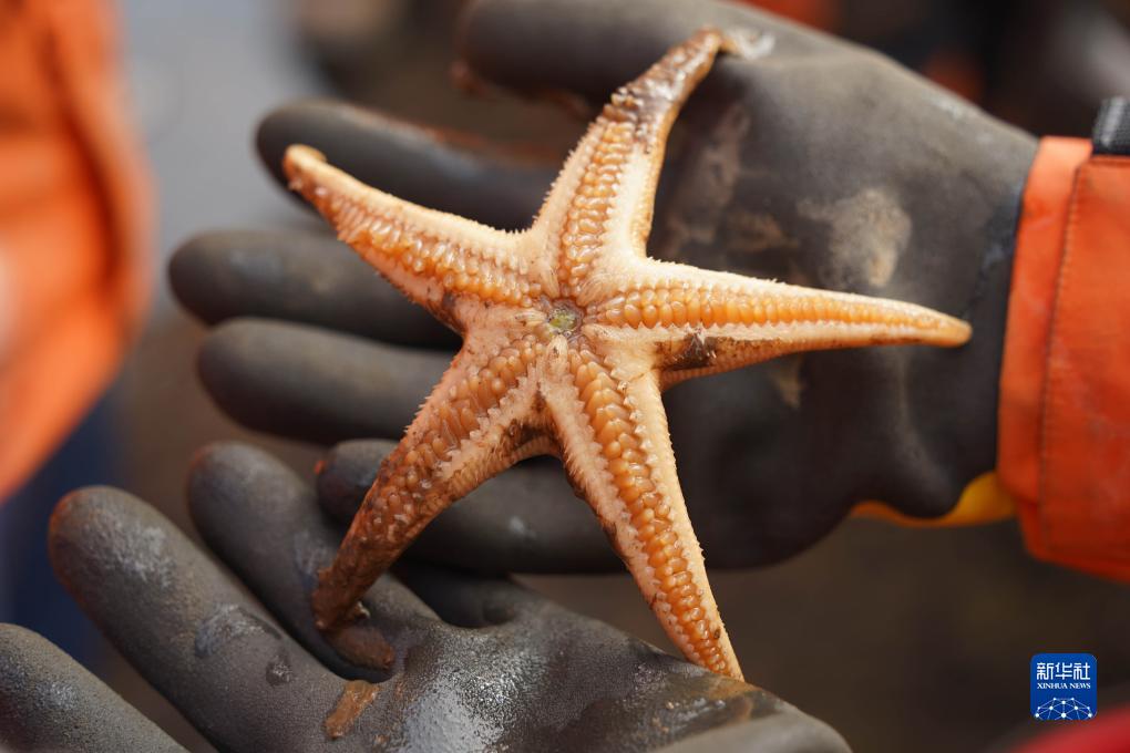 這是在底棲生物拖網作業結束后,科考隊員從樣品中搜索到的海星(8月4日攝)。