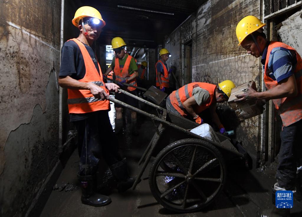 8月12日,在北京市門頭溝區醫院,因水災影響無法從事原本工作的受災群眾組成清淤隊伍,清理醫院地下室的淤泥和垃圾。新華社記者 鞠煥宗 攝