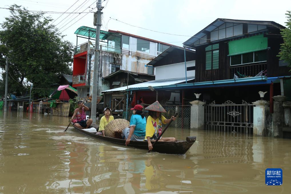 8月12日,在緬甸勃固鎮(zhèn)洪災(zāi)區(qū),人們乘船出行。新華社發(fā)(苗覺梭攝)