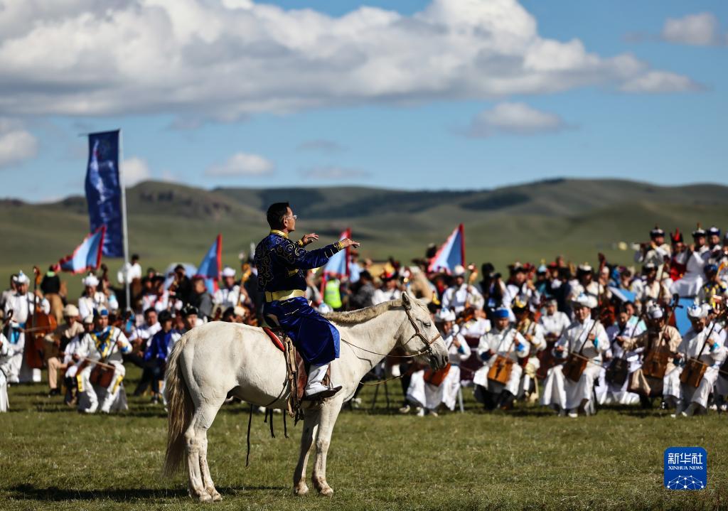 8月18日,在蒙古國泰吉山谷,文化節開幕式上一名樂隊指揮騎在馬上指揮樂隊演奏。