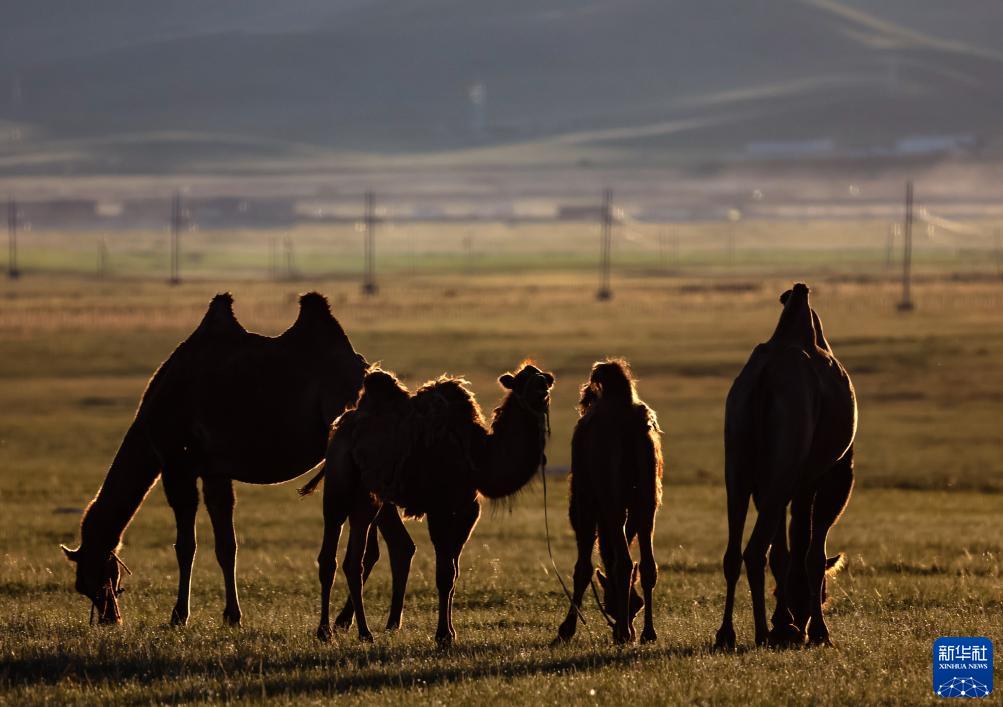 這是8月18日在蒙古國泰吉山谷拍攝的沐浴在夕陽里的駱駝。