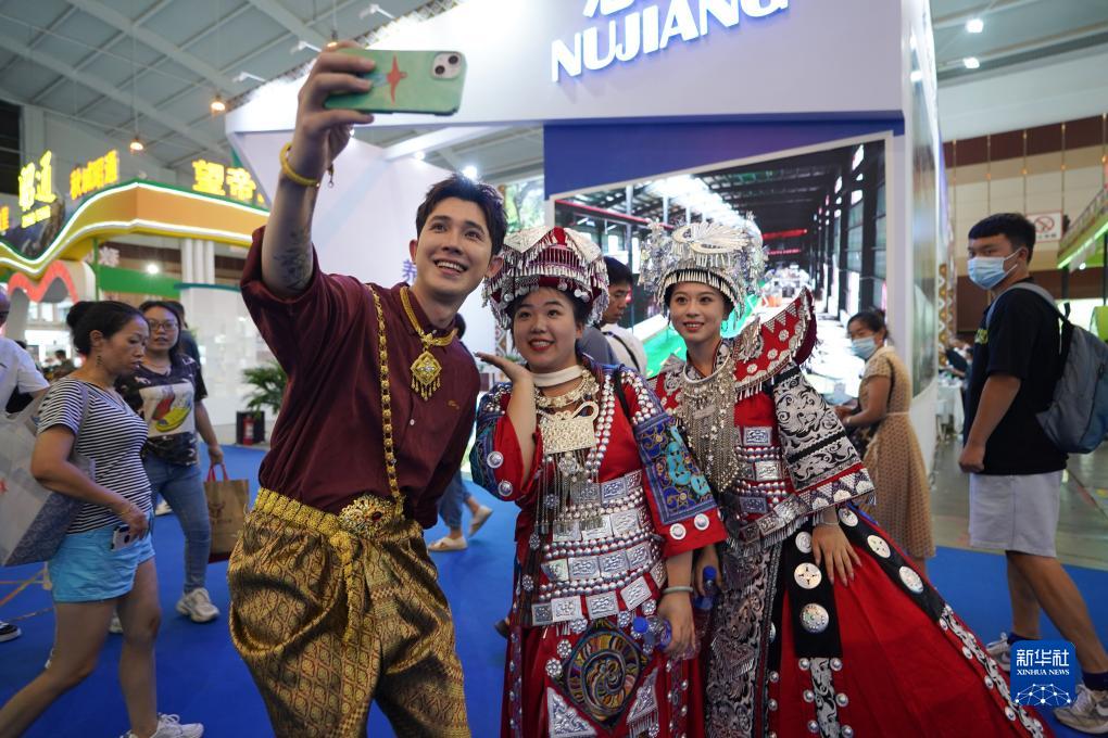 身著民族服裝的年輕人在第七屆中國—南亞博覽會上拍照留念(8月17日攝)。