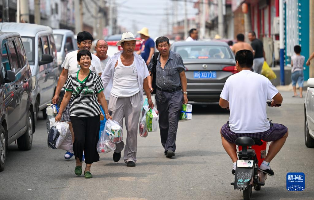 8月20日,在天津市靜海區臺頭鎮,返村村民在街上相互問候。