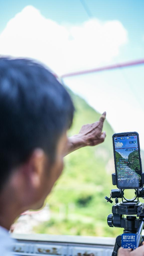 馬選軍在直播介紹北盤江大橋(8月16日攝)。