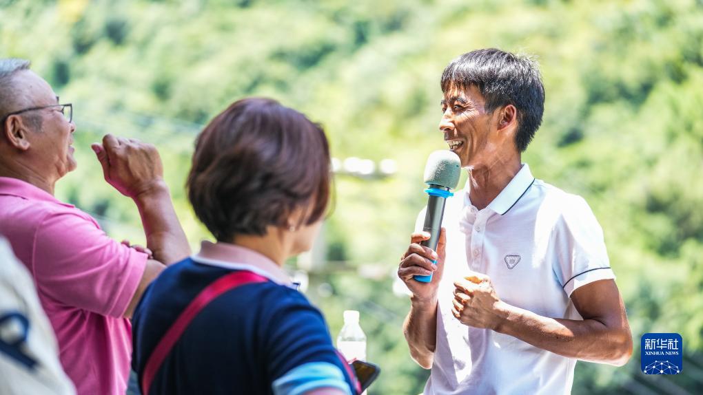 馬選軍在向外地游客介紹北盤(pán)江大橋和家鄉(xiāng)的變化(8月16日攝)。