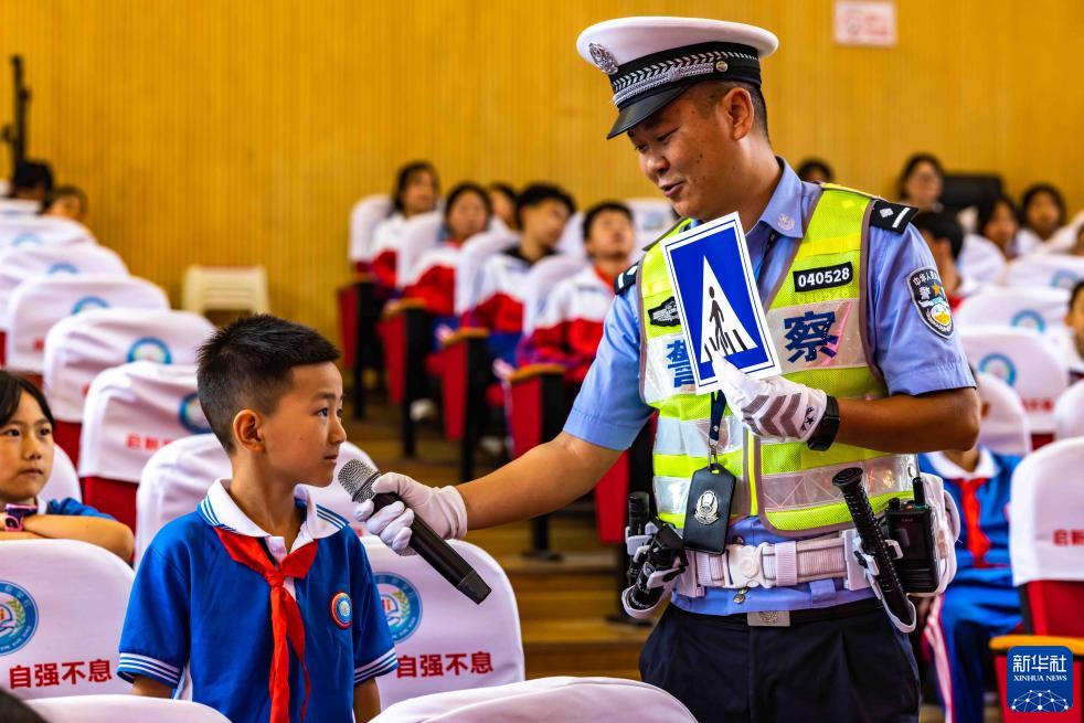 8月21日,交警在貴州省安順市西秀區啟新學校為學生講解交通安全知識。