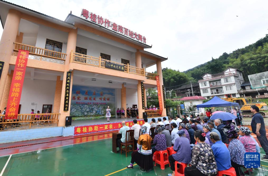 融水苗族自治縣懷寶鎮盤榮村村民在新建的粵桂協作文化戲臺前觀看演出(5月26日攝)。近年來,融水縣投入粵桂協作幫扶資金,建成盤榮村百姓大舞臺、農特產品展示中心等設施,打造產業融合發展示范村。