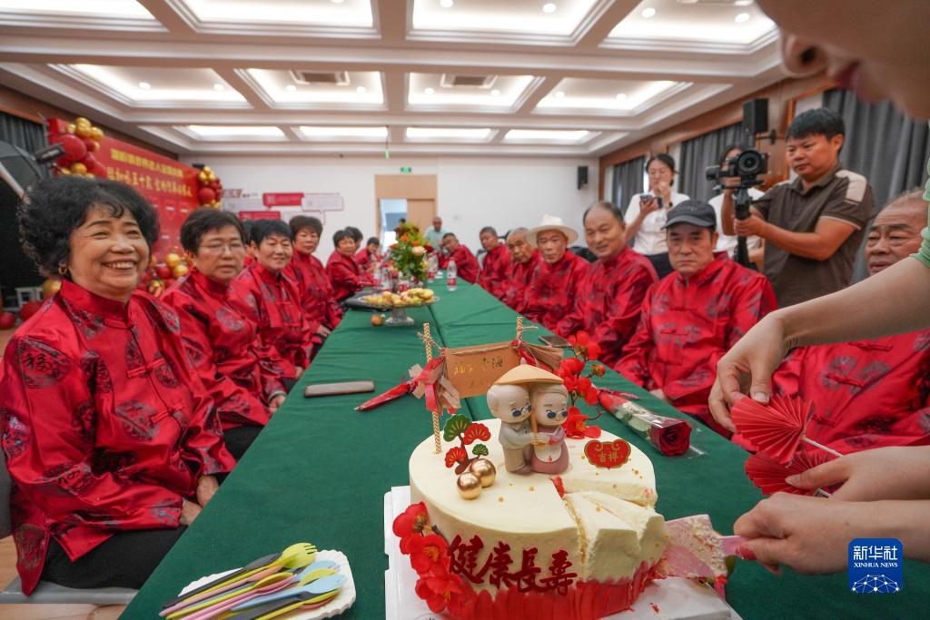 8月22日,在浙江省瑞安市湖嶺鎮綜合文化站,工作人員為金婚夫婦送上蛋糕。