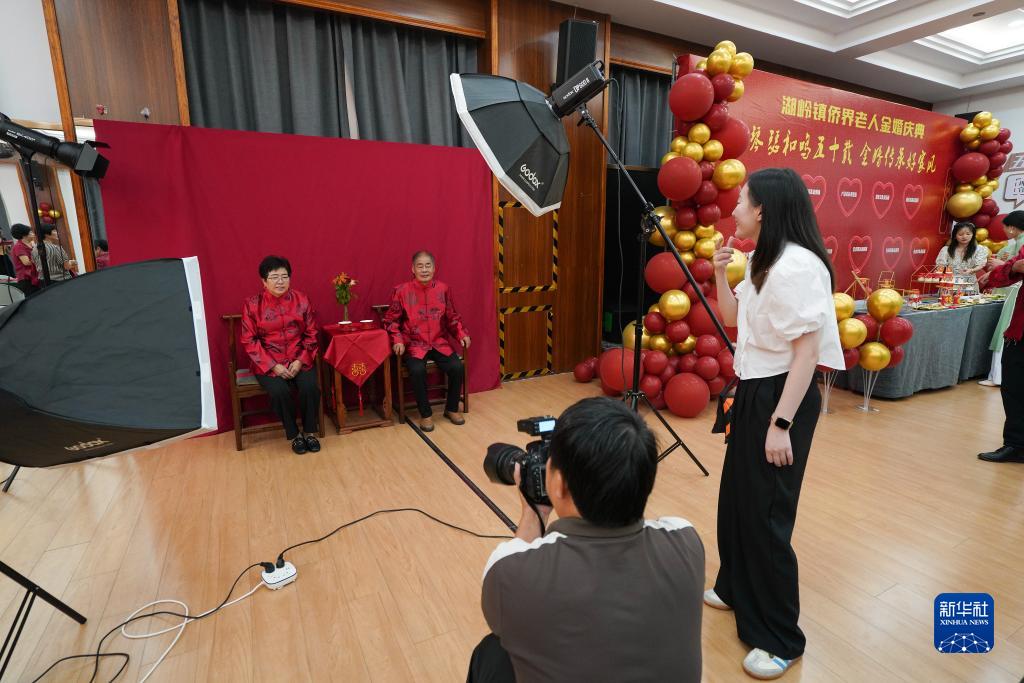 8月22日,在浙江省瑞安市湖嶺鎮(zhèn)綜合文化站,工作人員為金婚夫婦拍攝紀(jì)念照。