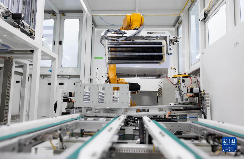 8月22日,在四川省丹棱縣經濟開發區的眉山璉升光伏8GW高效異質結電池項目電池車間清洗制絨工序中,機械臂搬運硅片。