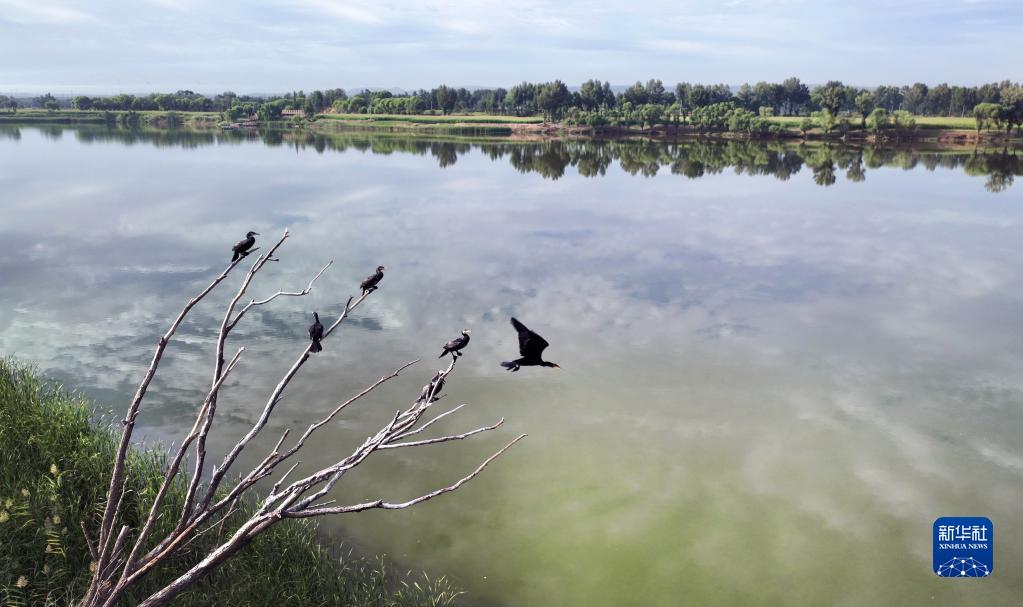 幾只鸕鶿在蘆河岸邊的樹梢上歇息(8月19日攝,無人機照片)。