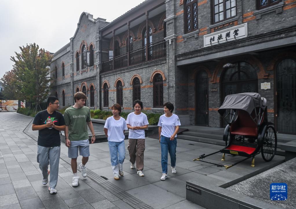 8月23日,在嘉興南湖邊,一名外教(左二)帶著參加培訓的導游們模擬外國游客游覽過程中各種場景。