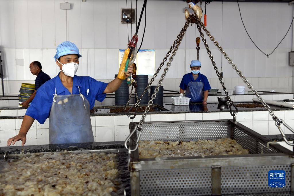8月22日,在山東省濱州市沾化區馮家鎮隆旺水產的加工車間內,工人正在給海蜇更換浸泡用水,保證咸度適中。