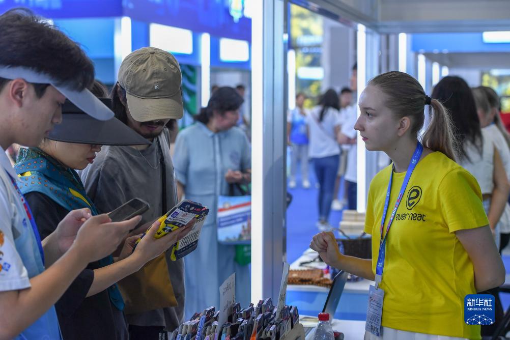 8月23日,在第十四屆中國(guó)—東北亞博覽會(huì)東北亞商品館,俄羅斯參展商向參觀者介紹商品。
