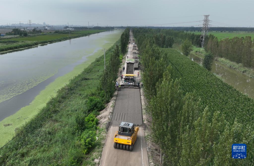 8月23日,工人在唐山市豐南區陡河沿岸鄉村公路建設工地施工(無人機照片)。