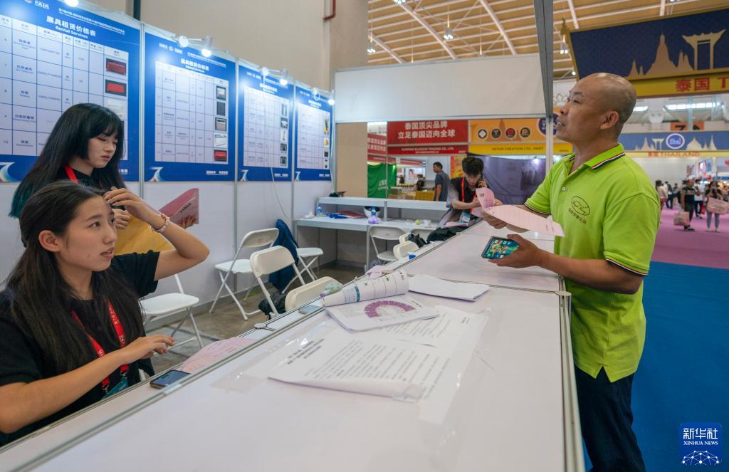 陳杰在昆明滇池國際會展中心內的服務臺領取提貨單(8月18日攝)。新華社記者 陳欣波 攝
