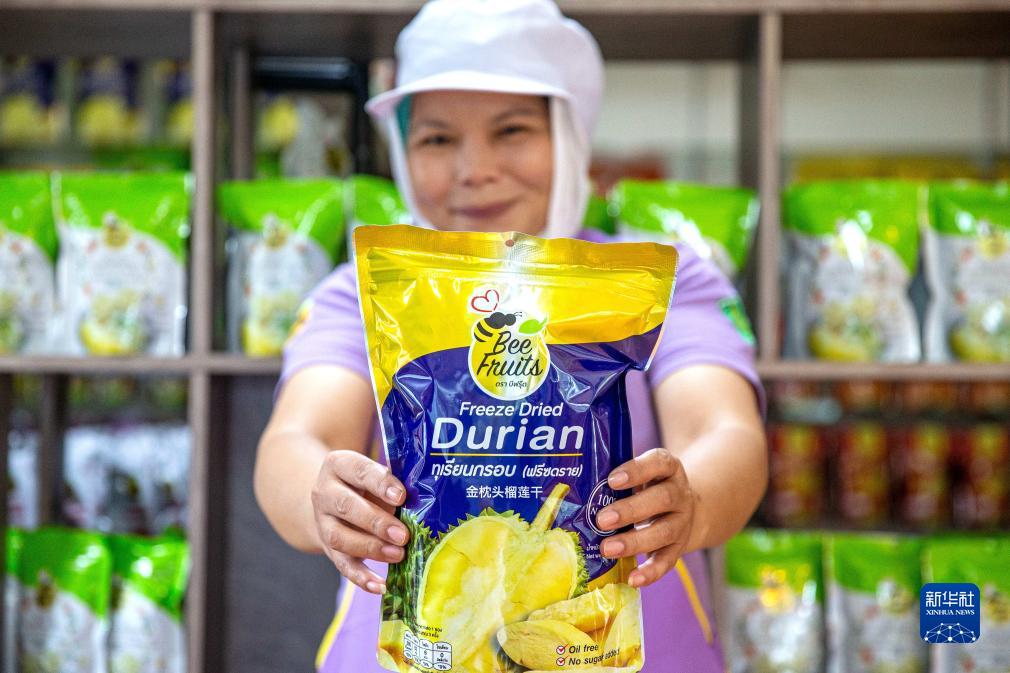 8月17日,在泰國尖竹汶府,尖竹汶果品公司工作人員展示榴蓮干產品。新華社記者 王騰 攝
