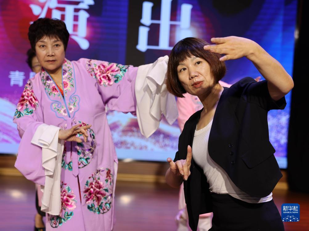8月23日,在河北省滄州市青縣市民文化活動中心夢想劇場,戲曲表演老師指導戲曲愛好者進行練習。