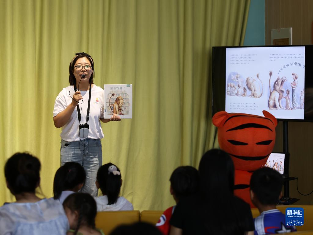 8月23日,志愿者在河北省滄州市青縣市民文化活動中心少兒閱覽室訓練孩子們的閱讀和語言表達能力。