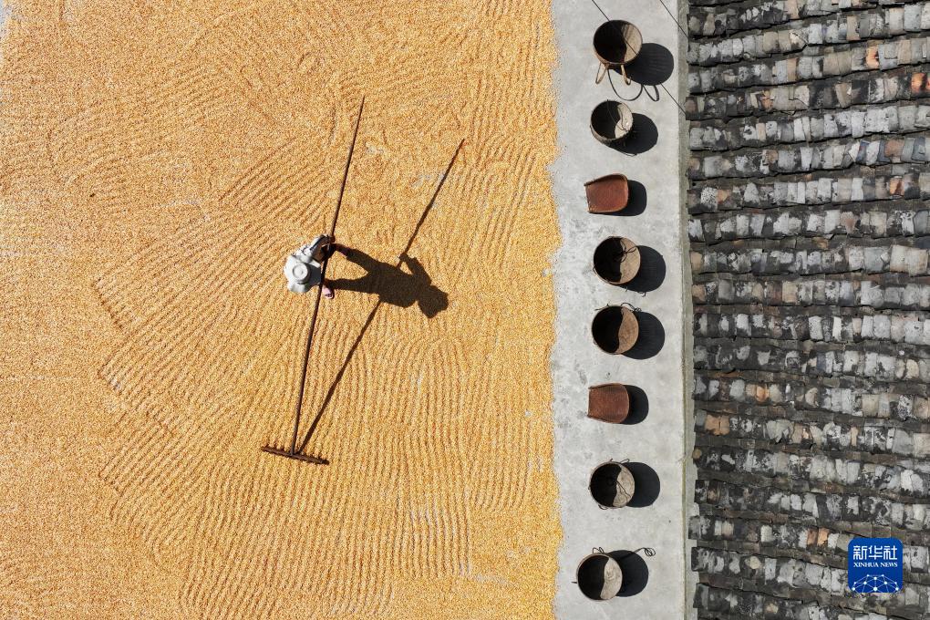 8月23日,重慶市黔江區沙壩鎮三臺村村民在晾曬玉米(無人機照片)。