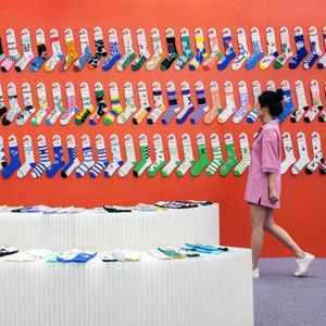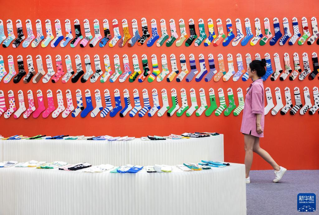 8月23日,一名女子在襪業博覽會上參觀。