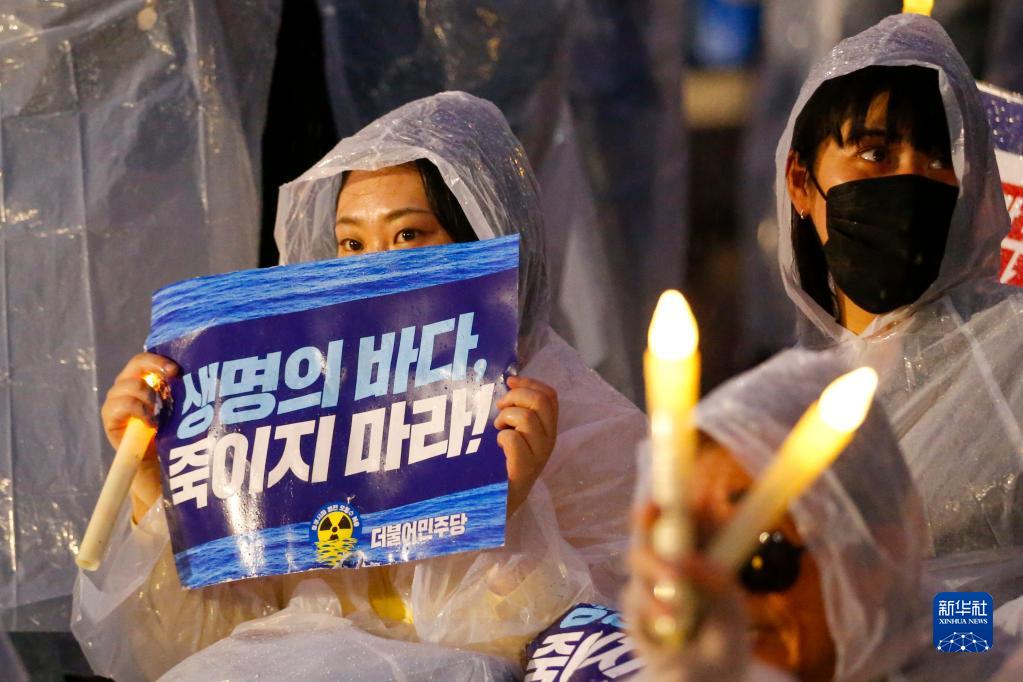 8月23日,在韓國首爾的國會議事堂前,一名女子手舉“生命之海,不要殺我!”的標語參加韓國最大在野黨共同民主黨舉行的集會,抗議日本政府決定啟動核污染水排海。