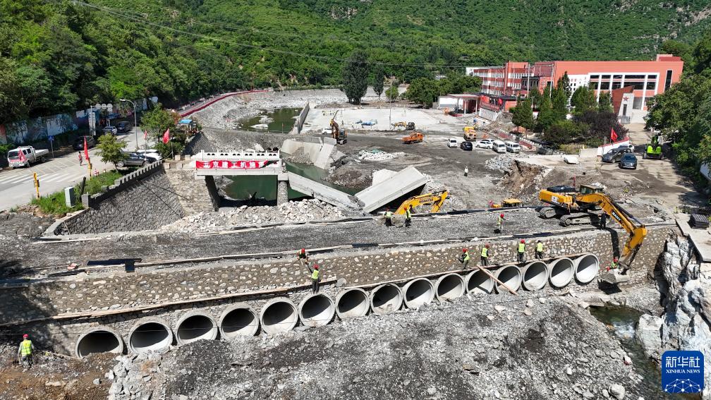 8月23日,在北京市房山區霞云嶺中心小學,北京建工機施集團的施工人員在搶建供學校與外界通行的新橋梁(無人機照片)。