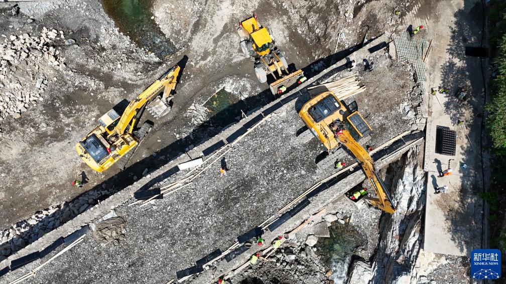 8月23日,在北京市房山區霞云嶺中心小學,北京建工機施集團的施工人員在搶建供學校與外界通行的新橋梁(無人機照片)。