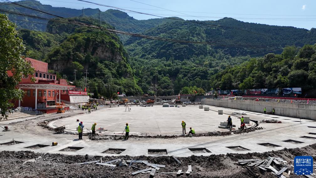 8月23日,在北京市房山區霞云嶺中心小學,北京建工機施集團的施工人員在進行操場施工(無人機照片)。