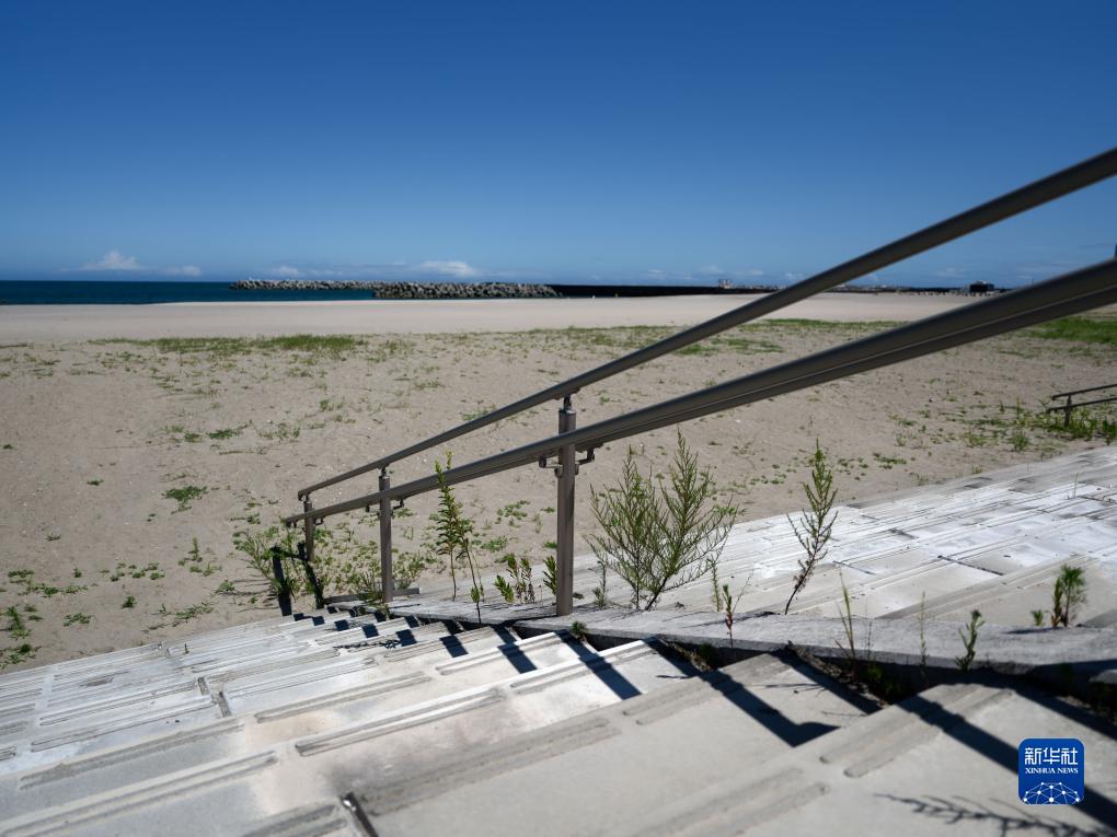 8月22日,日本福島縣相馬郡新地町釣師浜海水浴場的臺階上雜草密布。新華社記者 張笑宇 攝