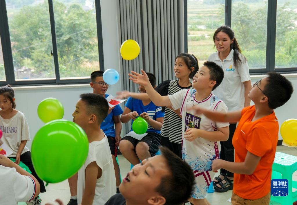 8月24日,在重慶市九龍坡區新民村村委會活動室內,孩子們在心理咨詢師志愿者的指導下進行互動小游戲。新華社記者 劉潺 攝