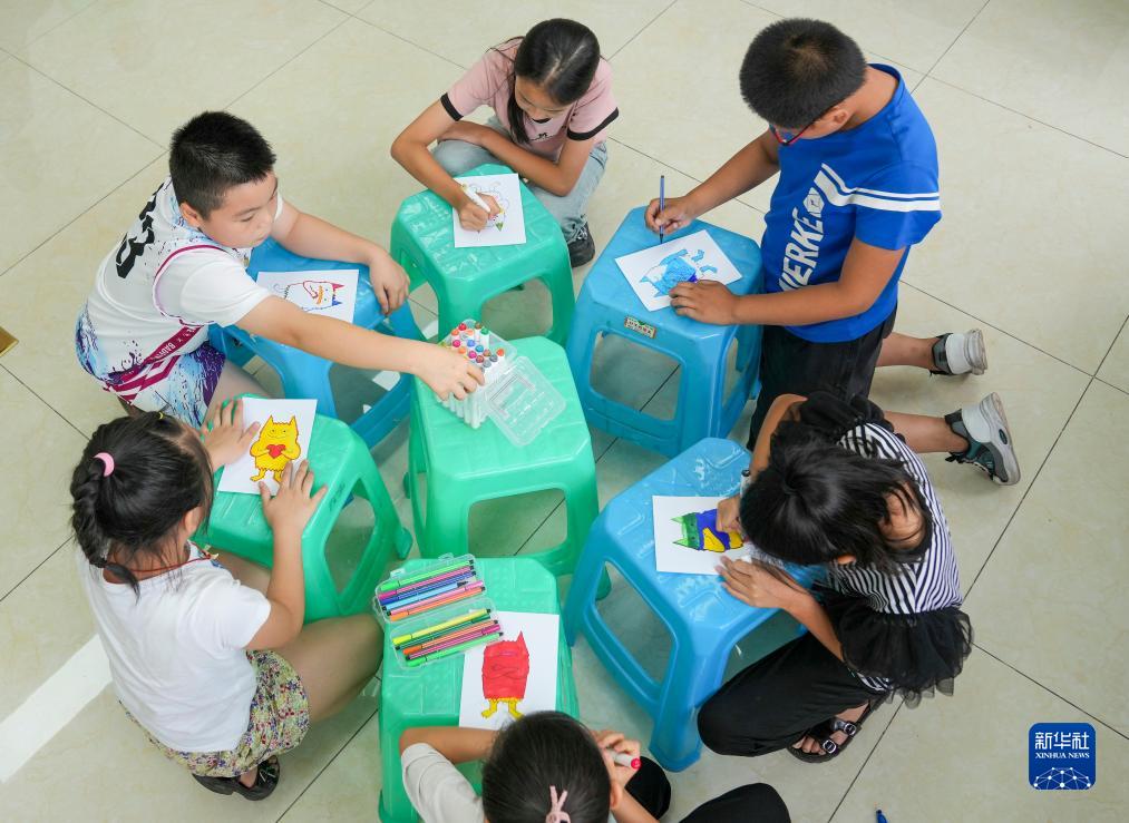 8月24日,在重慶市九龍坡區新民村村委會活動室內,孩子們在心理咨詢師志愿者的指導下為“情緒小怪獸”上色。新華社記者 劉潺 攝