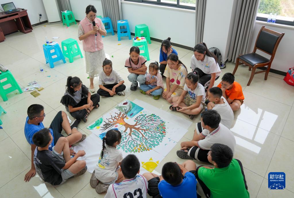 8月24日,在重慶市九龍坡區新民村村委會活動室內,孩子們在心理咨詢師志愿者的指導下進行互動小游戲。新華社記者 劉潺 攝