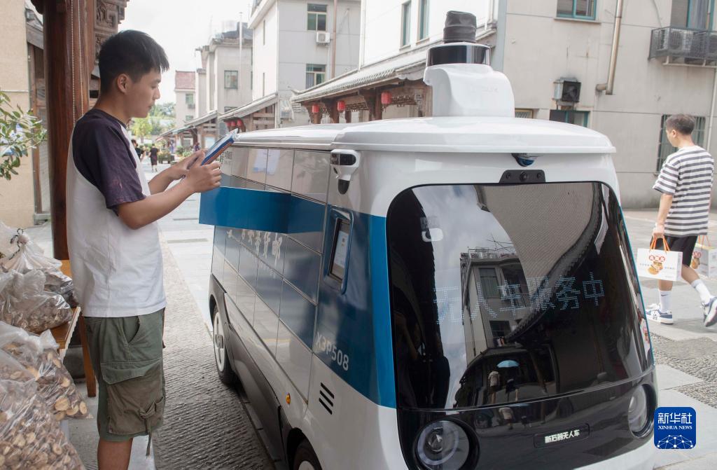 當(dāng)日,浙江省磐安縣尖山鎮(zhèn)烏石村啟用“客貨郵”無(wú)人快遞車,長(zhǎng)方形無(wú)人快遞車穿梭在山村街巷,派發(fā)、收取快遞件。無(wú)人快遞車由中郵驛站系統(tǒng)設(shè)置,村民從微信小程序上預(yù)約收貨、發(fā)貨。