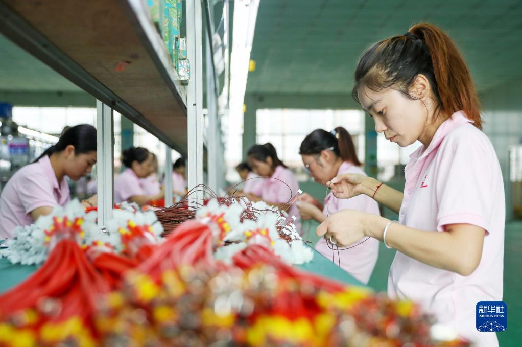 8月24日,四川省廣安華鎣山經開區一家電子企業的線束車間,員工在流水線上作業。