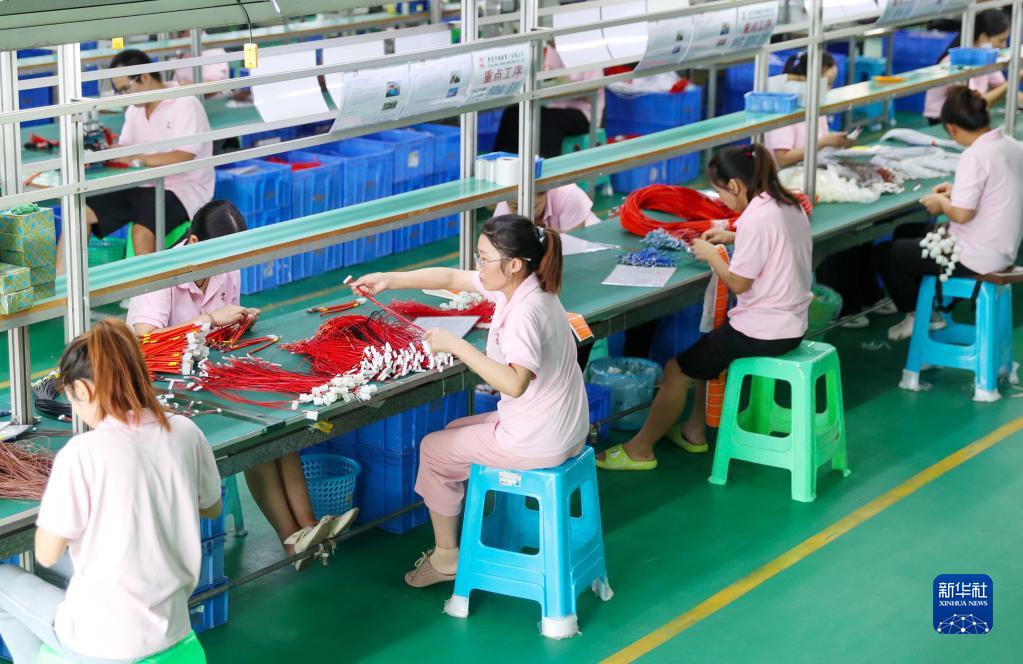 8月24日,四川省廣安華鎣山經開區一家電子企業的線束車間,員工在流水線上作業。
