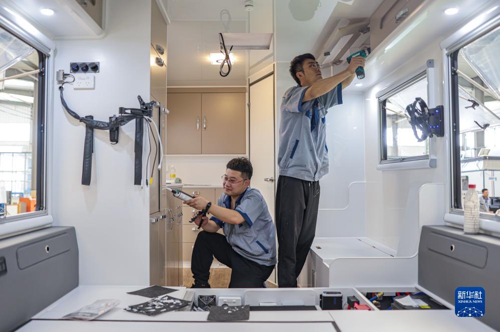 8月24日,山東省榮成市一家房車制造企業(yè)的工人在安裝房車組件。