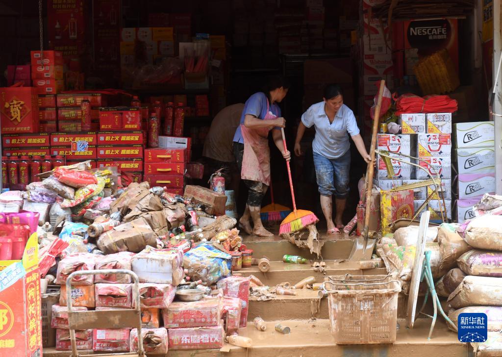 8月24日,在廣西百色市凌云縣下甲鎮,人們在清理被洪水浸泡過的商店。