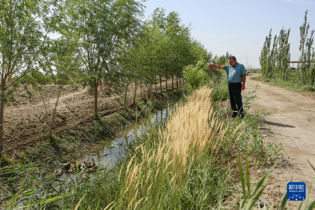 8月17日,爾肯·熱衣木在棉田附近的水渠旁呼趕鴨子上岸,以清點鴨子的數(shù)量。
