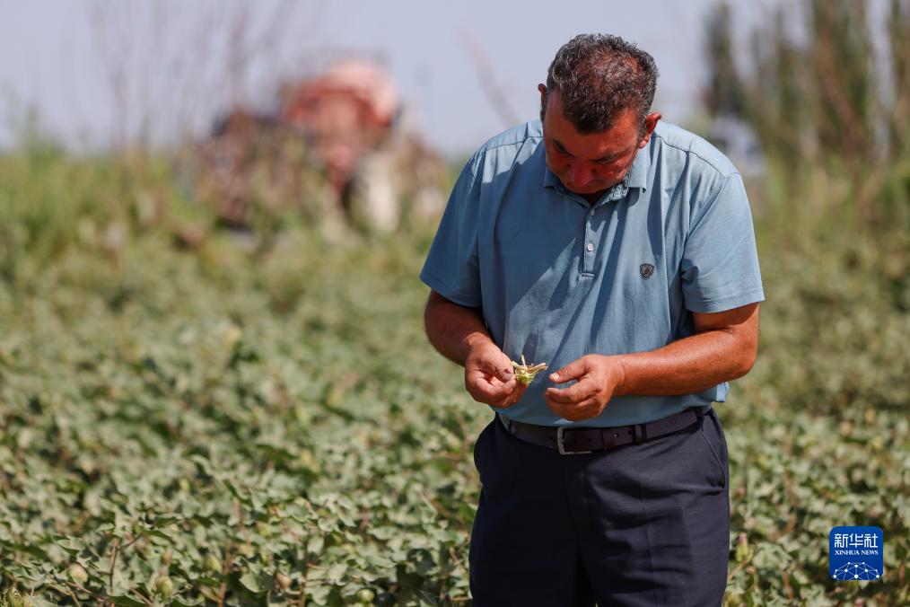 8月17日,爾肯·熱衣木撿起一株干枯的棉桃,分析棉桃干枯原因。