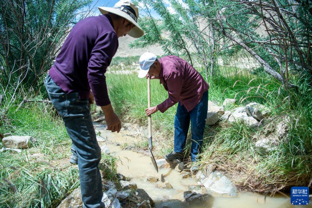 久美老人和村民一起疏通灌溉水渠(8月24日攝)。