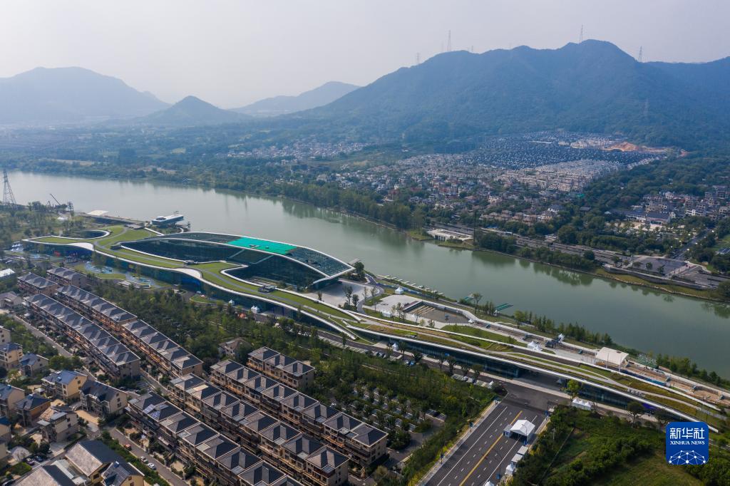 8月24日,空中俯瞰杭州富陽水上運(yùn)動中心,屋頂被綠植覆蓋(無人機(jī)照片)。新華社記者 徐昱 攝