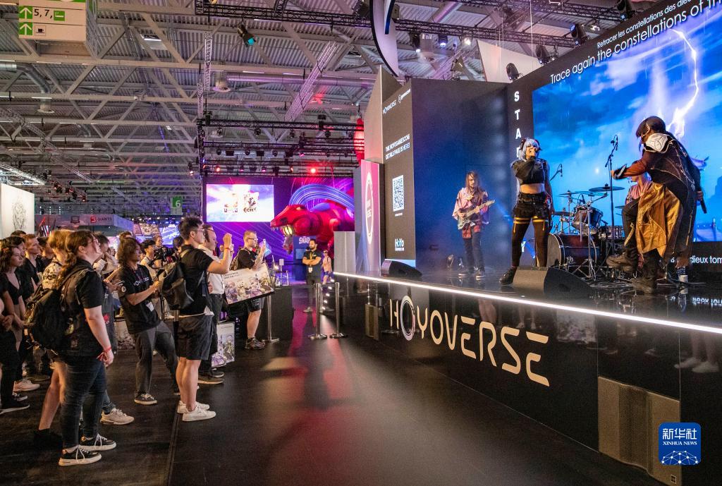 8月23日,在德國科隆游戲展上,人們在米哈游展臺觀看現場樂隊表演游戲歌曲。